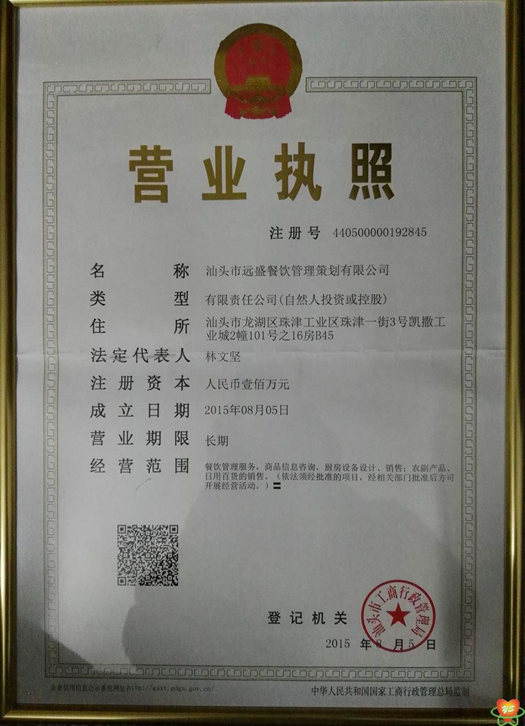 汕頭市遠盛餐飲管理策劃有限公司營業執照